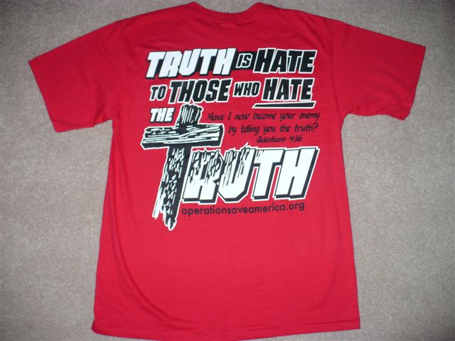Friends, We just got back late last night from Washington, D.C., and meeting with our Senators about the hate crime legislation that they will be voting on this week. Here's where we are in America. Monday morning we arrive outside "OUR" Supreme Court Building. Doc Johnston and his four children, myself and a few others were headed into the building to use the rest rooms. We all wore the same red shirts which said: "Jesus is the Standard" on the front and the back read: "Truth is Hate to those that hate the truth. Have I now become your enemy by telling you the truth?" We were approached by a female guard and she told us that we would have to take off our shirts and turn them wrong side out before entering the building. I missed the shot--didn't have my camera out yet. We've known for a long time that our Government hates God, but this is our tax dollars at it's best. Trained guards to censor every expression of God entering the building. I tried to find a shirt that was given a pass by that guard, but it was chilly and jackets concealed some of the shirts. Attached are pictures of the shirts that had to be (censored) turned wrong side out to enter the halls of the building where our laws are interpreted (US Supreme Court).