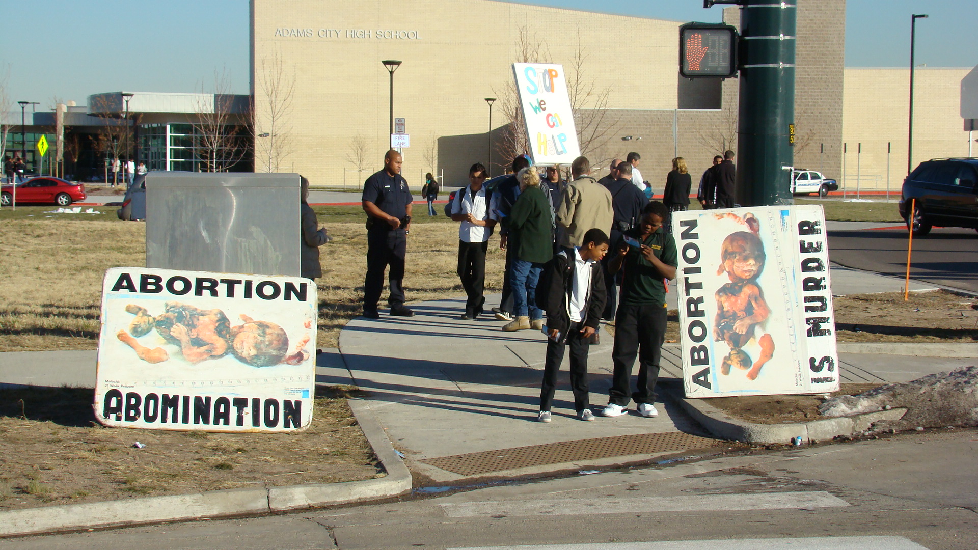 At lunch time we went to Adams City High School in Commerce City where we were met by the principal, Wes Paxton. Wes did not want us or our displays anywhere near the students and after a short discussion about where we would be allowed to stand he called the police. When the police arrived Mr. Paxton tried to get us moved to across the street. After several discussions and six squad cars on campus, Lieutenant Cubbage arrived and allowed us to remain in place. Very few students left the school grounds at lunch time so it was decided that we would stay on site until school at 2:20 p.m. That decision led to over one thousand students getting pro life literature and gospel tracts in their hands and one salvation. A young lady named Celene approached us with sincere questions about a relationship with Jesus. She told us that there are no Christians in her family but that she heard a preacher talk about Jesus on T.V. and that she wanted to know more. We took her through the gospel and she prayed and accepted Jesus as her Lord and Savior!