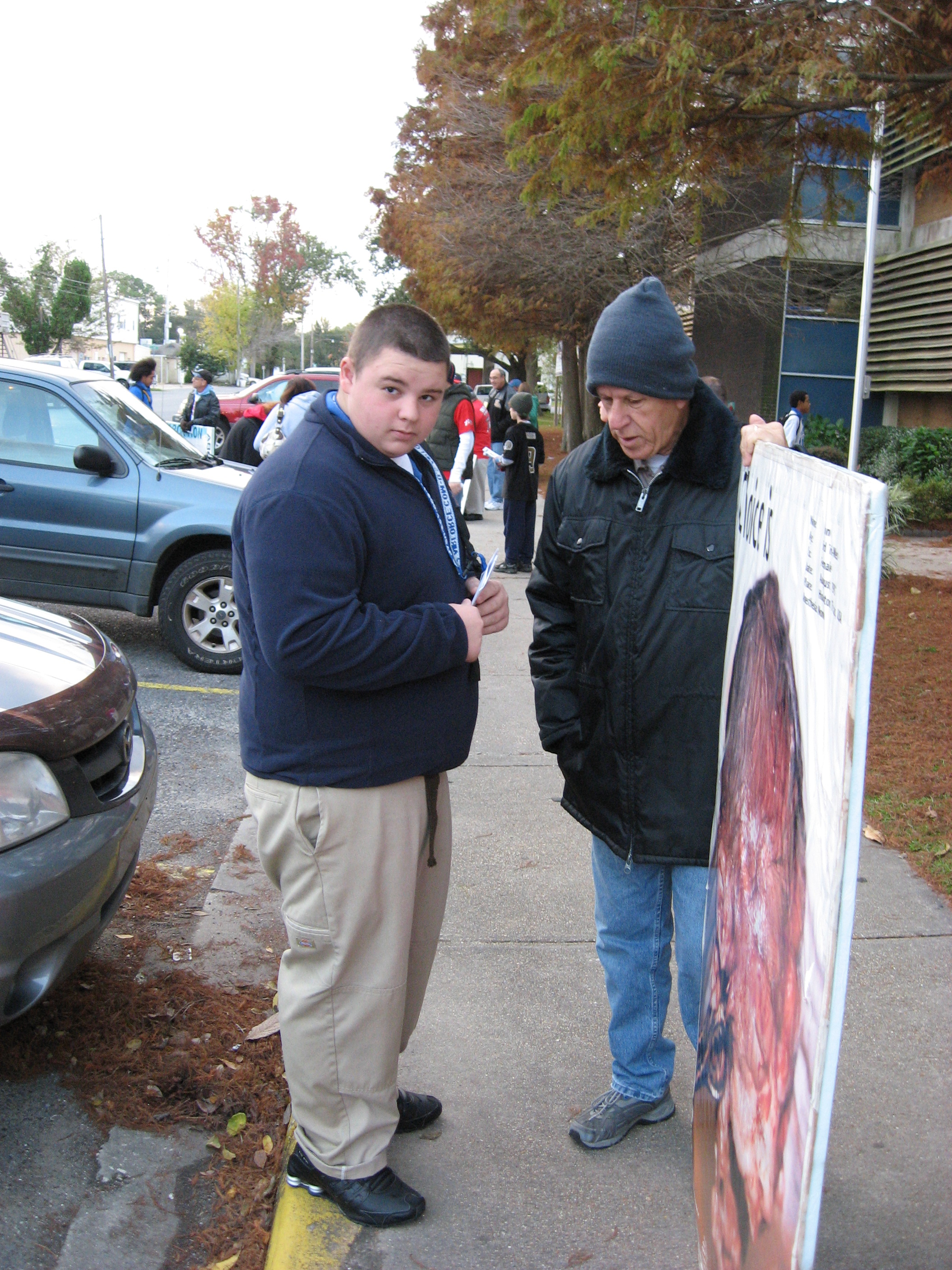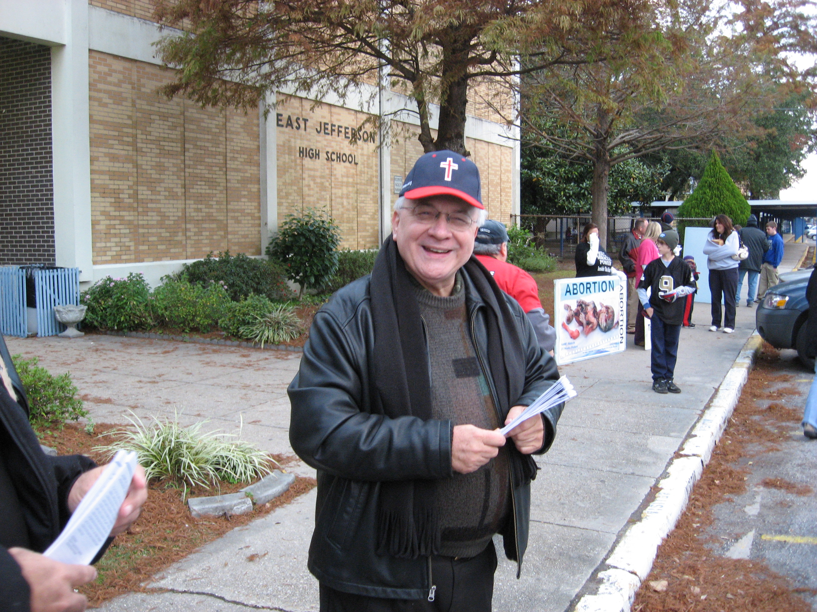 The “real” saints of New Orleans decided last week they would hold their vigil just one week later so as to honor Jim. We showed up at East Jefferson High School at 6:45 AM. The weather, a bit brisk but tolerable, and approximately 20 of the faithful saints of God took Jesus to the school. As the students began to pull up, we began to share the hope of Christ and expose abortion for what it truly is, murder! The students received us well and so did most of the teachers! Yes, that is right, almost all were openly receiving our tracts on abortion. One R.O.T.C. leader from the school, who was standing at the entrance of the building, was heard saying (as students were gathering tracts), “Well, it is nice to know you will be reading today.”