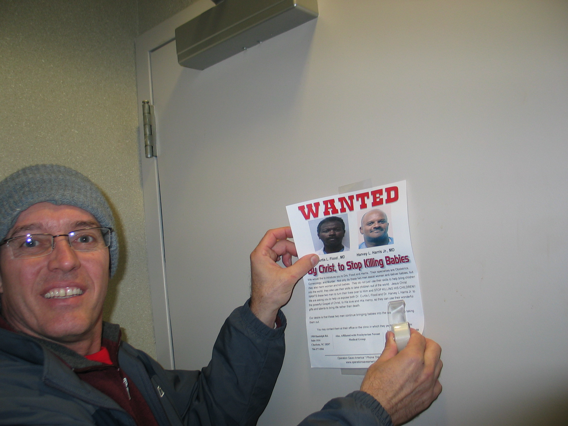 Unfortunately, they just stopped killing at one abortion mill and began applying their grisly trade at another. The saints, armed with flyers calling these “doctors” to repentance and to Christ, went to each floor of a ten story building and posted these flyers in the bathrooms, elevators, corridors, and offices. They went to each office to reveal the horrible truth about what these men were doing to our children.