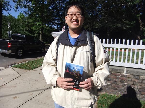 THEN……a Chinese guy walked by, and I asked him if I could share some scriptures with him about where he could spend eternity, and offered him Mark Cahill’s book. His eyes widened and he said, “I have that book!” I said, “Did I already give you one?” He said, “No, the author did!” I said, “Mark Cahill?” He said, “Yes!” I said, “When?” He said, “Back in April, at the airport in Atlanta! We talked for a while.” I was blown away, and told him that Mark Cahill was actually at this very corner back in November, witnessing just like he did at the airport. He was shocked that I even knew who Mark Cahill was, and said that he did start reading the book, and it was pretty interesting. Mike and I followed up with him with more of the gospel, but he could only talk for a minute because he was on his way to class. But he took my number and said that he was going to finish the book and he might get in touch with us. I took his picture with the book, and told him I would send it to Mark Cahill and tell him “Hi” from him. He was totally blown away by the whole thing, and just kept shaking his head and smiling. He said his name was “Koh” and wanted me to ask Mark if he remembered talking to him.