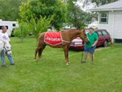 Hi, I am Elsie Darrah in Nortonville, Kansas. ... I have a 21 year old registered chestnut Tennessee Walking Gelding, Darrah's Delight "Sunny", that I can no longer ride because of my health problems (3 back surgeries and Parkinson Disease). I have owned Sunny for his entire life. I asked Flip and Gib if they might allow him to fill in for Judgment on this ministry. When his travels are over I would like you to have him placed in a therapeutic riding program. Sunny is a well trained horse that has taught many people how to ride and drive a horse. He has been in parades carrying the American Flag in 5 states and used as a trail riding horse for many years. |