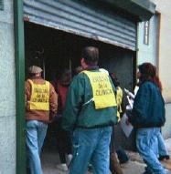 May 22, 2001 There were over 20 prolifers out on the streets praying on this windy, rainy and chilly morning. The God of our universe takes residence in us, His people. "O my people, may you live good and perfect lives before the Lord our God, may you always obey his laws and commandments, just as you are doing today." 1 Kings 8:61 Pastor Randy was there with some of the CHS students. Everyone stood and prayed off to the side. We were able to talk to a few of the moms. There were ten "clinic escorts" present with yellow vests on (including four Wescorts and Donald on video). Their main job is to combat our efforts to persuade moms to keep their babies, as we offer them viable help. We had Nancy, Vinny and myself capturing some events of the morning. Abortionist Blumenfeld came in a little late, after 9:30 am. Seven moms came to abort. One changed her mind. One turned away, leaving five precious babies to die. Edgar Perez (#1) was on duty at the door. It was very hard to talk to the young moms dropped off in front of the doorway. We had to speak loud so they could hear us across the line because Stan Scott's injunction was still being issued on all of the prolifers. There were up to five police cars present at one time during the course of the morning. I really believe this is a deterrant to some clients. Who would want to go into a place that is surrounded by police? It surely symbolizes that something is wrong. I think it is a shame that all these police officers have nothing more important to do. What a waste of taxpayer's money! If they were inside the killing center trying to save the babies' lives, then that would be a different story. Something is definitely wrong with this picture. Woe to us, America. "And I sought a man among them who should build up a wall and stand in the gap before Me for the land, that I should not destroy it, but found none." Ezekial 22:30 The mom that changed her mind is 21 years old. She is Mexican and 16 weeks pregnant. She spoke Spanish with Carmen. She was dropped off across the street from the center and we were able to share information with her. We gave her Spanish literature and showed her pictures of her baby's development. Carmen took her to meet another Hispanic speaking mom that could share with her what happened to her at the mill. When Carmen took Leonarda home, it was so ironic that she lives next door to baby Rosa's mom, Claudia. They are both Mexican and can understand each other very well. Now Claudia will be able to help Leonarda. What a small world. God is so good! I hope to see all of you who have been M.I.A. (missing in action) on Friday morning. We meet 7 a.m. and on at the very "gates of hell" where God's little "image-bearers" are sentenced to die. We, the Church of Jesus Christ, continue to stand for righteousness... until the killing stops!