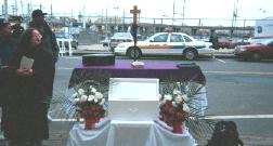 January 16, 2001 Forty prolifers came out to pray today as the weather broke and became a little warmer than it's been (40 degrees). The CHS students were back from their NY missions trip as fifteen youth came out to pray early including a few homeschoolers. Pastor Randy led them in prayer and Father Smith was also there to represent the clergy of our local area. We urge all pastors to come out with their congregations and take a stand against this injustice in our communities. Friday we will remember the 40 million babies killed in America since Roe v. Wade made abortion legal on 1/22/73. Our annual vigil starts at 7 a.m. as we enter into National Sanctity of Life Weekend. We will have special Sunday morning and evening services during this sad anniversary. Abortionist Shubb came a little early today at 9 a.m. Officer Mack (#789) was on duty at the door of the killing center. It is ironic that a police officer that was trained to protect life is a guard at the door of a death camp where little baby boys and little baby girls are being killed.