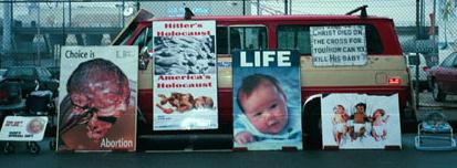 May 1, 2001 There were well over 40 Lifers on the streets today. The CHS youth came to pray before school. We thank God for them and their fine example to others. Fifteen moms came to abort. One couple did not even go in. They pulled up around 8:30 am. The escorts went up to their car but they told them to get away. Carmen was able to talk to them a little later. She shared the info about the abortionists and the center. She gave them newspaper articles and told them about the botched abortion in September. The couple was very surprised to hear all this. After listening they said "let's go!" and changed their minds. PTL! One save and four turn-aways. This calculates to ten dead babies. Shame. Jasmine was going to be around for post abortion counseling. Twelve "deathscorts" were on duty. Edgar Perez (police officer #1) was at the door of the killing center. Please keep this officer and all the abortion providers on your prayer lists for salvation. Abortionist Shubb came in to do his grizzly work around 9:30 am covering his face with his baseball cap. Donald was on video for them and we had Joe N. and Will for us. There were three clergy to represent the leadership of the church (Fr. Smith, Pastor Miller and Pastor Randy). We see tremendous hypocrisy with church leaders in America. I just heard this message below from Mark Crutcher's Southern Baptist Pastor, Dr. Ray Bandi: