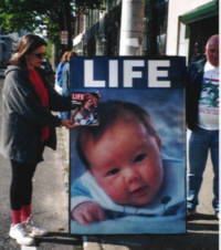 May 4, 2001 APRIL STATS - SIX BABIES SAVED AND TEN TURN-AWAYS Thirty-five praying Christians came out to the streets today outside of Summit "abortuary" on 211 Middle Street. "The spirit of God has given us no cowardly spirit." 2 Timothy 1:7 There were three priests (Markey, Smith, Powers) and one Pastor (Dave) to represent the clergy of our local community. Some CHS students were out before school. Popular teacher, speaker, and author Howard Hendricks warns The Church about "enshrining" the gospel in a church building. He wrote "I can't find anything of Scripture that commands a lost person to go to church; I know a lot of Scripture that commands believers to go into a lost world." Fourteen "deathscorts" were present trying to combat the efforts of sidewalk counselors to persuade moms to reconsider their intent to kill their children. We had Millie and Anne on video. We captured numerous maneuvers and tactics by the pro-aborts that we would never be allowed to do. We even captured a so-called federal employee speaking with Patricia and giving our camera person the finger. She threatened arrest to the prolifers. Later on Pat was showing Scott literature about "tolerance" in the schools, we know what that is all about (tolerating what God calls sin). Officer Barnum was on duty and Donald (Pat's husband) was on video for them. Twelve moms came to abort. We had one baby saved and two or three turn-aways. We calculate this to eight or nine dead babies. The baby that was saved was five months old. He or she is about twelve inches long. The mother definitely feels movement. If a sound is loud or startling, the baby may leap in the womb! The mom came at 8 a.m. She is hispanic and 22 years old. She did not know that they did not do abortions at five months at the Bridgeport mill. She had told the Spanish counselor on the phone that she was four months. That was fine. But at twenty weeks, the clinic did not want to take any more risks. The botched abortion they did in September was twenty weeks. I know that young mom wishes they turned her away! She is maimed for life and can never have children again. Father Markey and Carmen got to talk and pray in Spanish with this crying mom. We gave her all the resource information and she decided not to go any where else to have her baby killed. Carmen got her name and number and will do follow-up. We gave her our last pair of baby booties and a video to take home to watch on abortion. We had a good group of women out yesterday to minister to the moms after the abortions until 1 p.m. Five of the moms took literature and some were prayed with. I want to encourage Moms to bring their children out. It makes such an impact for the parents going into the mill to see live children outside. Friday, May 11, we will have a Mother's Heart Prayer Vigil to commemorate Mother's Day next Sunday. Please bring any scriptures or testimonies you would like to share on motherhood. It will start at 7 a.m. and go to 9:30 a.m. "You did not choose me, but I chose you and appointed you to go and bear fruit - that will last. Then the Father will give you whatever you ask in my name." John 15:16