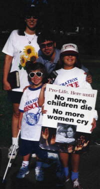 May 11, 2001 THREE BABIES SAVED Around 50 caring people came out to the streets to intercede for the precious babies that were sentenced to die at our local abortuary. Moms and children were there to participate in the Mother's Heart prayer vigil. Prayer was led by clergy including Pastor Dave, Father Markey, Father Smith and Father Powers. My granddaughter Colbi, 8, was there to help pass out roses with the other children (Jane, Mary) to Moms entering the mill. We had pink and blue baby balloons to symbolize life. Edward Goulding (#86) was the police officer on duty for the killing center. Donald was on video for them and we had Joe N. and Will for us. Seventeen moms came to abort. Three changed their minds. Three turned away. We believe that eleven babies were left to die! One of the young moms that went in (around 15 years old) was with her mother. Carmen spoke to the daughter and Millie spoke to the mother. The escort told the baby's grandmother not to talk to Millie, that she was a protester. Millie said "No, we are here to help you. My friend got hurt in here." Millie gave them a #800 business card for help. We are so glad they changed their mind and came out of the mill later on without killing their baby. Another couple going in said they were just going for an ultra-sound came back out. They took the information for help. One of the dads in the car took all the information. Three moms of dead babies took information for help after the abortions. Michelle was calling to one of the moms from the window. This was the first mom there that Colbi gave the rose to in the vestibule at 7 a.m. She was on the phone crying and looking out the window at the signs of life and death and at the balloons to celebrate life. We hope she did not go through with the abortion. Another woman came to pick up her friend who had an appointment to kill her baby. The friend came out and said she was not in there. Our prayers are heard for the moms that have appointments. We hope that this mom heard the tug of the Holy Spirit and changed her mind for good. One of the moms told me she changed her mind, was pregnant and decided to keep her baby. I wanted to offer her help but it was very difficult with Pat and Scott coercing her and telling the cop I was harassing her. When this happens I just verbally tell them to call the Hopeline if they need anything. "Blessed are those who have been persecuted for the sake of righteousness." Matthew 5:10. Another girl that changed her mind left with her friend. She was surrounded by "deathscorts". She did take a rose and a Hopeline business card for help.