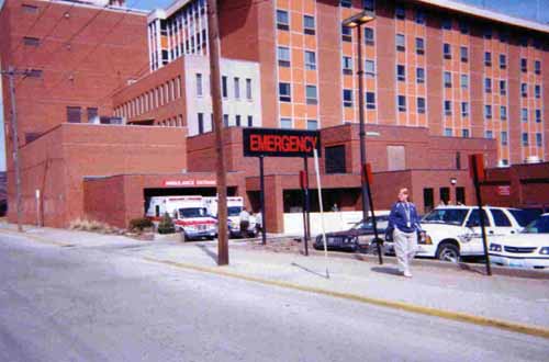 Ambulance backing into Emergency Room with fallen woman inside.