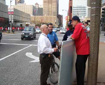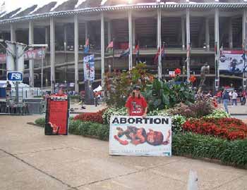 55,000 people descended on this historic ballpark for the very last game ever to be played there as a new stadium is being erected. Despite the order to evacuate, and twice being threatened with arrest by Sergeant Dan, many Bibles and flyers with Isaiah 1:15,17 “When you spread out your hands in prayer, I will hide my eyes from you; even if you offer many prayers, I will not listen. Your hands are full of blood…Seek justice, encourage the oppressed. Defend the cause of the fatherless, plead the case of the widow.” and “Can You Hear the Babies' Cry” were passed out, and Jesus' name lifted up. We were told that our signs were “offensive” but what is really offensive is that society has allowed the legalized murder of innocent lil' boys and girls for over 32 years. God bless Lieutenant Anthony Russo for coming to our rescue as we were threatened with arrest. “These people have a First Amendment right to be out here. Leave them alone.”