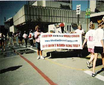 As the crowd of over 60,000 breast cancer victims, survivors, and supporters marched down the streets, we advantageously placed ourselves in the moving crowd handing out the information. You couldn't help but notice the desperation on their faces and feel compassion for these sisters who were valiantly fighting this giant called breast cancer. The sad part was realizing that approximately 41,875 women died in the year 2004 of breast cancer, and vital information that surfaced in the early 1980's was deliberately being withheld from women by the American Cancer Institute. Breast Cancer was unheard of in the 1930's. What has been introduced to society that now has breast cancer at epidemic proportions? Elective abortion, and the numbers are soaring and victims are becoming younger and younger and a lot with no history of breast cancer in their families. What hypocrisy it was to see the Planned Parenthood people with their flaming pink shirts claming to be all about women, the very same people who are giving women consequential bad “choices” that cause breast cancer..ABORTION on demand and the N.O.W group marching hand in hand. They tore our fliers up, and they yelled for other women to do the same, which fell on deaf ears. Women were gladly taking the flyers and information till we ran out. We passed out over 1350 flyers and over 100 brochures and spoke with some of the participants who were interested in our mission to let women know the truth of this link. “We're here to help women make good choices and to give them more than one,” said Angela. “Women are responsible for their health care, shouldn't they be made aware of the risks and the most preventable cause of breast cancer? Why aren't women being told the truth?”