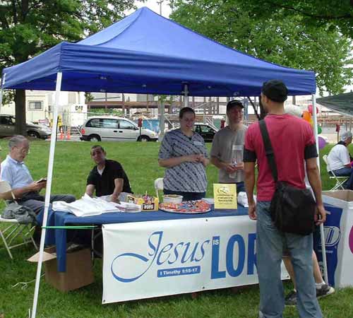 Christians rented a vendor booth at the homosexual festival. We passed out 100 Bibles, countless Gospel tracts, and videoes of personal testimonies from those whom Christ has redeemed from homosexuality.