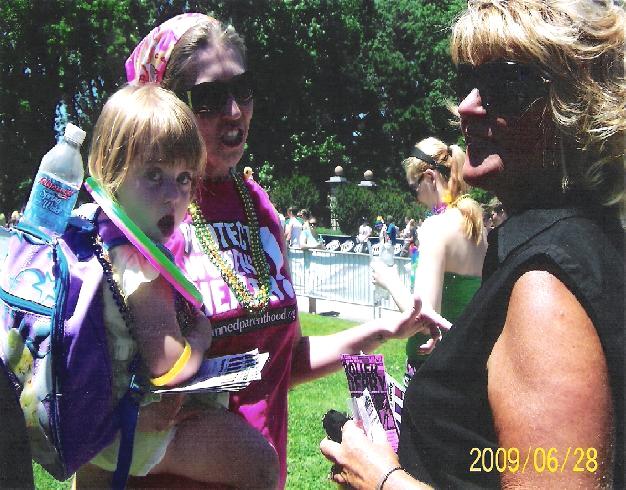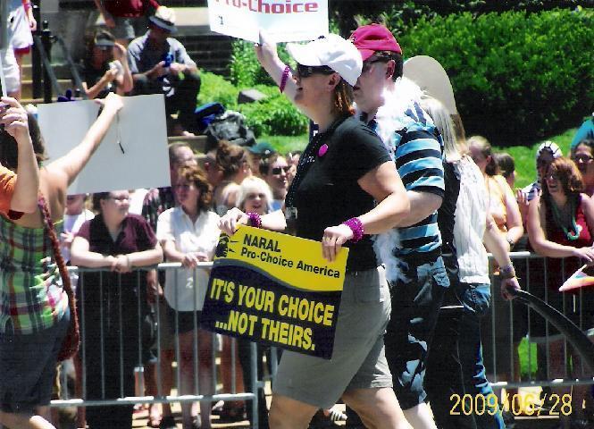 After the parade of churches such as the Metropolitan Community Church, Episcopalian Churches, United Churches of Christ, and the Hebrew Congregation Church and floating gay bars, the deathscorts from Hope(less) and Planned Barrenhood over in St. Louis trotted by braless with their “It’s your choice” signs. A familiar face was handing out “Planned Parenthood parties for your choice” invites. We held out our hand and the deathscort, aka Hot Nrs, placed one in our hands, stood back, and realized who we were. She continued down the route a little shocked and dismayed. Just our very presence in the crowd was threatening because of who we stand for and represent.