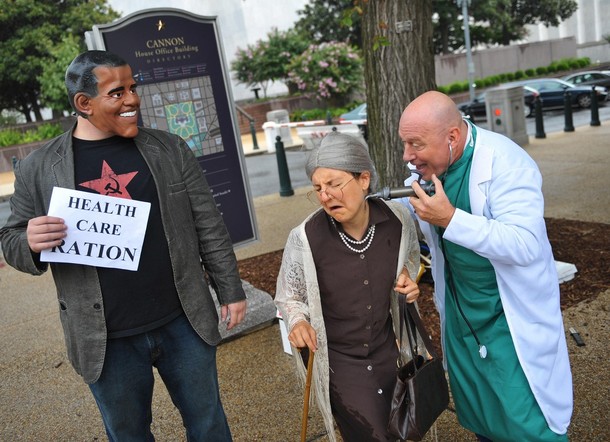 After we preached, we set up and performed powerful prophetic parables, hard hitting and somewhat humorous skits, to expose the horrors of government rationed care. Supposedly, CNN ran one skit in its entirety. We performed in front of the Cannon building and the White House before many tourists. The sketch consisted of three patients with all health care rationing cards. A grandmother, seeking a pacemaker, goes before a death panel made up of three ghouls. As she proudly shows her Obama healthcare card, the bureaucratic ghouls observe her age, condition, and the costly treatment and all three hideously laugh as they condemn her to death. At this point, President Obama forcefully grabs the health care card from her trembling hand and gives her a R.I.P. plaque instead. She is led to a “doctor,” who compassionately injects her neck with poison and puts her out of her misery.