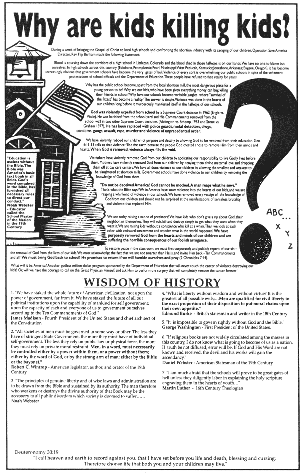 ADVANCING AGAINST THE GATES OF HELL - OPERATION SAVE AMERICA Bringing the Gospel of Jesus Christ to every gate where the enemy is robbing, killing, and destroying is the mandate of Operation Save America. We brought this powerful Gospel to the abortion mills where the smallest and weakest are being slaughtered. We brought it to the federal courts that have declared war on Almighty God and those called to be His witnesses. We brought it to "Barnes & Noble Booksellers" that use God's little children as sexual toys to satisfy perverted adult lusts. We brought it to government schools that expelled God and banished Him from the school yard and are now being filled with bloodshed and violence. We brought it to the City Halls of both Buffalo and Rochester and held these cities in contempt of Almighty God and His Law. We brought it to the Church of Jesus Christ that is looking for peace when there is war. GOD IS GOING BACK TO CHURCH "Stand at the gate of the Lord's house and there proclaim this message: 'Hear the word of the Lord Reform your ways and your actions, and I will let you live in this place.'" Jeremiah 7: 2-3 April 25, 1999, marked the beginning of our nationwide "God is Going Back to Church" campaign. Once a month, on a Sunday morning, a selected evangelical church (dynamic in its preaching and teaching of Christ) that is within seven miles of an active abortion mill will be presented with graphic pictures of aborted babies, live babies, Scripture signs, and brochures entitled Sing a Little Louder. For a long time now we have been unwilling to go to this gate. The reason? We wonder who are we (Who am I, Lord?) that we should confront God's church? Secondly, we are afraid that we may cut off all supply and support of our own ministries. But in reality there is no entity more responsible for ushering us into the era of Roe v. Wade than the church of Jesus Christ. We have failed in our responsibility to our God, to His church, to our children, and to our nation. We have allowed an enemy to enter the gates of our cities because he was first allowed to enter through the gates of God's house. "The kings of the earth did not believe, nor did any of the world's people, that enemies and foes could enter the gates of Jerusalem. But it happened because of the sins of her prophets and the iniquities of her priests, who shed within her the blood of the righteous." Lamentations 4:12-13. Our first church visit was to the Faith Tabernacle in Lockport, New York. Upon seeing the signs and brochures being passed out, Pastor Wayne Dent (a very pro-life pastor) invited Pastor Mike Warren and myself in to preach to his congregation for both of the services. Krisdene O'dell was asked to sing and God did an awesome work. We were absolutely overwhelmed at the response as Pastor Wayne called his congregation to the altar. When the Lockport News asked him about the graphic posters displayed in plain view of young children he said, "This is reality - harsh reality! How do you go about dealing with graphic violence We worry very much about the protection of the children in our lives, but what about the protection of the children in the womb?" He told the Lockport News that this visit by Operation Save America served as a "wake-up call" for him and his congregation. Pastor Dent sent us off with enough money to buy everyone lunch. WHY KIDS ARE KILLING KIDS (Columbine High Murders) This ad (gif file size is 212K) was a full-page newspaper ad taken out in the Sunday edition of the Rochester Democrat & Chronicle on Mother's Day May 9, 1999. It has 259,000 subscribers and 450,000 readers. Pastor Mike Warren is using this ad as a brochure to pass out at schools during the "God is Going Back to School" campaign in Rochester. Please copy it and put your name and phone number in the blank area and pass it out to as many kids at school as possible. The feedback has been tremendous! On Monday night, the day before the shooting at Columbine High School, Rev Benham had prophetically spoken that violence in schools was a sign and judgment from Almighty God. We were stunned at the news from Littleton, CO. There is a direct relation between murder in the womb and murder in the schools. Phillip and Wendy Faustin of Rescue Colorado had gone to Columbine HS twice in the past year in their God is Going Back to School campaign. They said the kids were very receptive and some dynamic Christians even took brochures into the school to pass them out. Today, God has been allowed back into school in Littleton, Colorado. " He rebukes them in his anger and terrifies them in his wrath Kiss the Son, lest he be angry and you be destroyed in your way, for his wrath can flare up in a moment. Psalms 2:5,12. Will it always take such a tragedy? BARNES