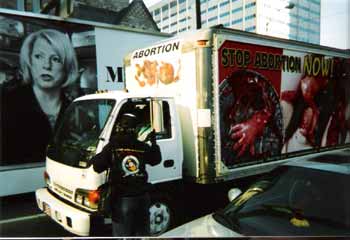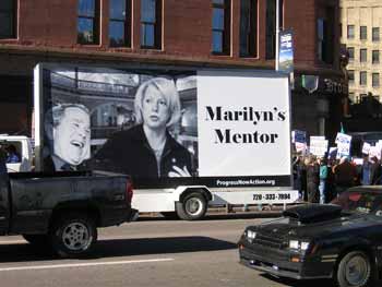 The Bush protester rented a totally ineffective billboard truck, it was laughable. One side had a picture of Bush and Marilyn and it said,“Marilyn's mentor.” The other side said, "Stop gay marriage so Osama won't get away." Most people down town didn't get what they were trying to say, not even their own people responded to the message. Our truth truck, on the other hand, got all kinds of response.