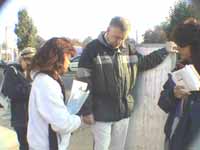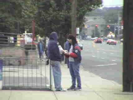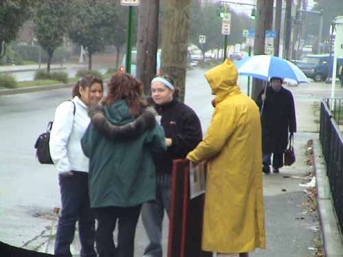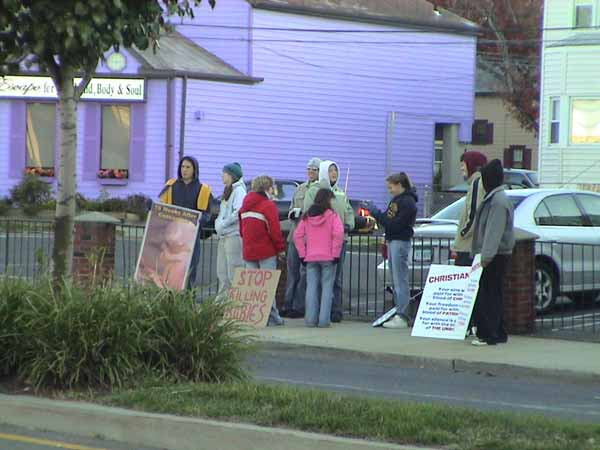 I thank God there are still "a few good men" around that are willing to come out to defend life and stand for righteousness. Most men today hold Christ at a distance. He knocks, but they don't let Him in. What we need in America is for the men to wake up and fight for their nation and their families. It is not hard to see, as Pastor Daniel pointed out, that we are living in the Laodician age. The Church confesses a savior that they don't know, they don't obey and they don't want in their lives. Oh so often we ask the moms going into the death camp if they are Christians. Some quickly retort "I go to church on Sunday!". Since when is the criteria for being a Christian going to church on Sunday? See how deceived we have become? They dine on cheap grace and reject the grace that costs everything. Carnally happy and spiritually miserable. Living as though they are right with God while they are naked, blind and self-conceited. Lord have mercy and shame on us. Many are called but few are chosen. We are so blessed to be His lampstands during these evil wicked days. We are called to overcome Laodicea. By His grace we are to become living epistles, as His spirit resides in us. God is calling us out of Laodicea. Get your eyes off the material things and buy the fire. You receive better eyesight when you are in the fire with Jesus. Jesus loves us so much that He wants to live in us and through us. He is appealing to individuals because the Church won't listen. We are extracted out of Laodicea to become His testimony in this final hour. Join us this Wednesday at 7am - 9:30am on 3787 Main Street as we reach out to the lost and needy who find themselves where they should not be. Don't be so busy planning your Thanksgiving festivities that you can't spare a couple of hours to save a life that may not otherwise get to celebrate Thanksgiving or Christmas unless we are here to persuade their parents to let their children live. NEXT WEEK THE KILLING WILL BE ON WEDNESDAY ONLY For the Least of These, THE STREETS, BRIDGEPORT, CT WED. NOV. 19, 2003 We continued the OSA National campaign today "God is Going Back to School." About 15 came out to Bullard Haven High School to hold signs and pass out gospel literature to teens going into the school. Even our own teens participated before they went to school. We passed out two big boxes containing approximately a thousand brochures. The truth was given to these youth on varying subjects including abortion, safe sex, abstinence, STD's, birth control, and salvation. I don't think it was a coincidence that the Lord led us to go there two days after Planned Parenthood was allowed into the school to spread their lies and give out condoms. Please pray for these youth, that the word of God would not return void but manifest into fruit for His glory. We were so grateful and blessed to have Pastor Miller and Pastor Pedro join us in this outreach endeavor. Bridgeport police were present. Everything went well.