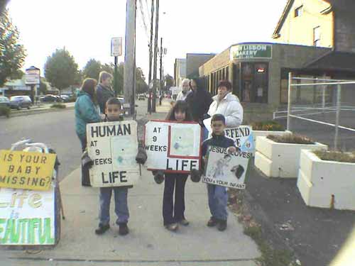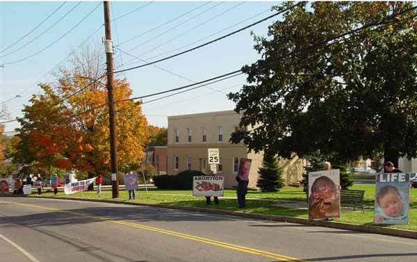 Fifty prolifers came out to Main Street on a bright sunny autumn day (11/01/03) to publicly proclaim the gospel of truth. This group included the Calvary Youth (above) and the Rosary Group (see photo). We were there between 7am and 10am. We encourage you all to please stay as long as you can. Let us know if you can hold a sign. From what we saw: "Do you not know that the wicked will not inherit the kingdom of God? Do not be deceived: Neither the sexually immoral nor idolaters nor adulterers nor male prostitutes nor homosexual offenders nor thieves nor the greedy nor drunkards nor slanderers nor swindlers will inherit the kingdom of God. And that is what some of you were. But you were washed, you were sanctified, you were justified in the name of the Lord Jesus Christ and by the Spirit of our God." 1 Corinthians 6:9-11