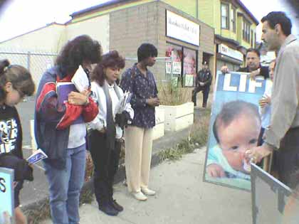Forty prolifers came out to pray today. Fr. Markey represented the clergy, he led a group in prayer (see photo). Bridgeport police, the new doorman, and six deathscorts were present today. It was busier than usual with: God is Going Back to School, this Tuesday, Harding High, Bridgeport. We will be there with signs and literature on the streets from 7am- 7:45am. Please pray and let me know if you can come. Meeting at 6:45 am. Can you sacrifice and get up a little early to reach out to these lost teens? Last month we were able to give out hundreds and maybe a thousand pieces of literature including gospel tracts, prolife info, abstinence info, post abortion, etc. WE NEED ALL THE HELP WE CAN GET. This is a missionary endeavor to reach the lost and needy youth of our community. September 2003