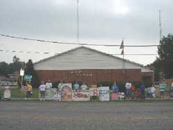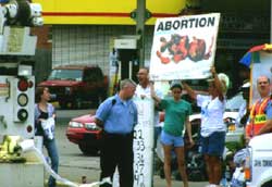 The annual Granite City, IL Labor Day parade was begun with an assault by auxiliary officer Dan Grayson physically grabbing and shoving Angela as she led the troops, approximately 50 proclaimers, into the enemy's camp to proclaim the truth of the abomination going on in this City of Slaughter, Jeremiah 19:5 … everyday. This once great city known for its prosperous steel mill is now infamously set apart for its three main industries: drugs, democrats, and the dismemberment of unborn children. The Jerry Lewis MDA Telethon was being televised raising money and public awareness of this debilitating and sometimes fatal disease for Jerry's kids, and proclaimers were raising the standard in Granite City , Illinois by bringing the battle to the streets by showing the truth and giving a strong rebuke for God's kids. Usually, Labor Day celebrations indicate an end to summer heat but temperatures from the opposition were rising at this event.. God was looking for a few good men and women to help Him deliver His mail, and that's exactly what we did. "Stop the Killing Granite City!" Brother David held a death toll sign from this past week's carnage at Hope(less) abortion mill, the biggest in the Midwest, known for no parental consent and specializing in late-term murder of the preborn. "This is how many babies were killed this past week, what are you gonna do about it? Jesus wanted these babies to live." Sister Grace called out to the parade participants, "This is what you represent by being in this parade" as she held the picture of a fully developed baby whose body was held by a gloved hand and whose severed head was laying off to the side. ABORTION. God have mercy! Approx. 13,104 lil American boys & girls have been murdered in the past year in Granite City, IL by the hands of homegrown terrorists. Can you hear their cries? Just like Abel, innocent blood cries out for vengeance in Granite City . Unfortunately, the 75 local churches just sing a lil louder, and the political leaders look the other way. Apathy is lethal. Silence kills. Psalms 94:1-23. "Who will rise up against the wicked?" This weekend was a big celebration for this City of Slaughter . This was an opportunity of a lifetime to have nothing to do with evil, but to rather expose it, Ephesians 5:11. Granite City, IL was enjoying picnics and a large parade, while only two blocks down from the festivities, children are being dismembered and dying daily with a burial by sewer. This once great city was known for a steel mill, now, it's known for baby dumping at a death mill. A older woman on a float throwing beads yelled "Let's have fun today," a proclaimer replied, "Yeah, that's what they said in the Nazi Holocaust, let's just sing a lil louder,". The woman retorted, "We'll worry about that tomorrow!" A young girl no more than 7 years old ran up to Brother David and yelled "shut up" then she spit on him and warned him "you'll be getting more than a butt whipping if you don't shut up!" And ran back to her smiling mother. Bro David replied, "Honey, I've been spit on before, Jesus has a plan for your life". Politicians looked in amazement as their names were called out for being supportive of the Kerry-Edwards bloody- choice team and the innocent blood on their hands. "Senator Haines, you can't be pro-choice and Catholic!"