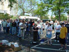 After three meetings with the Charlotte city council this year, and two meetings with the Charlotte police department, gentle Christian warriors made up their minds to take their message to the streets of the city of Charlotte. We were told by the Mayor and the members of the council that their hands were tied. We reminded them that the hands of the Church of Jesus Christ were not. No one in our government would dare take up this “politically correct” sacrosanct lie and expose it for the destructive murdering spirit that it is. The Word of God would become flesh in the streets – the theology of the church house would become biography at the gates of hell – Marshall Park! The battle was on! It would be a battle for life and genuine liberty. The mission? To bring the Gospel of Christ to the very gates of hell where precious human beings were being led to the slaughter by a diabolical lie - HOMOSEXUALTY! We had made it very clear to both the city council and the police department that there were flagrant violations of the Charlotte City Code in Marshall Park last year as "Charlotte Pride" paraded its perverted sin before the eyes of children and parents. There were booths with large pictures of naked men in a fully aroused state in all sorts of "unusual" poses. There were performers on stage joking about having sex with kids and looking for "dykes on trikes." There were transvestite dancers, thrashing, gyrating, and grinding while young kids watched and placed dollar bills in places they shouldn't. This "festival" was shocking in its arrogant disregard for anyone's rights but its own, and totally depraved perversion. This past Saturday, May 7, 2005, well-over 100 gentle Christian warriors converged on Marshall Park with their faces low to the ground, and the sharp double edged Sword of the Spirit (the Word of God) in their hearts and in their mouths. We met in the parking lot of the First Baptist Church of Downtown Charlotte and began with praise and worship, prayer, the proclamation of God's Word, the sounding of the shofar, and the march into battle.