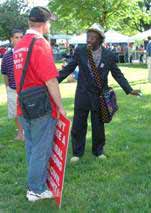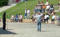 The praise and worship teams and the preacher boys set up the sound system on the public sidewalk outside the park and began some of the most beautiful praise and worship I have ever heard. The preaching was powerful and effective. The men of God stood upon the Word of God and let the chips fall where they may. One young lady (Rebecca) who was playing in the band on the center stage of Marshall Park came to the Fire students and thanked them for the marvelous and loving way they were conducting themselves in singing praise and worship. Many of you know Ante and Kathy Pavkovic from our last event in Columbus, Ohio. They have been so instrumental in bringing OSA together with FIRE. Ante and Scott Heldreth headed up the street preaching, and praise and worship. When the praise music is anointed by the Spirit of God, the preaching and witnessing becomes so much easier. What prevented the police from throwing us out of the park as they had done the previous two years was a precious lady by the name of Sheryl Chandler. She is the one who set up all of the meetings with the City Council and the Police Department. One of the great things accomplished in these meetings was the fact that real police officers were at the park, not lesbians and homosexuals who wear police uniforms. This was a great aid because it enabled all of us to remain in the park so that the love of Christ might be made known.