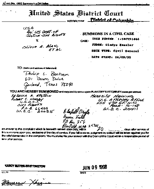 Reno Sues ORN Again Under Civil FACENever since the days of Jesus and then Paul has such a small band of Saints drawn the ire of the most powerful government in the world.A few questions to ponder: Why is the full force of the Attorney General of the United States of America and her Justice Department being brought to bear on a little group of 17 Saints who, quoting from the Complaint submitted by Janet Reno, are accused of the following? 30. One group of Defendants, which included, on information and belief, Defendants Gabriel, Heldreth, Newman, Odell, Reynolds, Rygg, Tyree, and White knelt in a cluster in the walkway of the main entrance, within the lines of clinic escorts who stood along the perimeter of the walkway. Thus positioned, these Defendants blocked ingress and egress to the main clinic entrance. 31. Another group of Defendants, including on information and belief Defendants Alaw, McGlade, McIntyre, and Turk, as well as other protesters, stood shoulder to shoulder in front of the line of clinic escorts who were securing the secondary entrance. Thus positioned, these Defendants blocked ingress and egress. to the secondary front entrance. 32. As a result of the obstruction, clinic staff locked the main entrance. 33. Defendant Mahoney stated to Defendant Goodman that protesters were needed at the clinic back entrance. After conferring with Defendant Benham, Defendants Henderson and Goodman led several Defendants, including, on information and belief, Defendants Alaw, McClade, and Turk from their position blocking access to the secondary entrance to the clinic's back entrance. 34. At the back entrance, clinic escorts were already. standing in a semicircle to preserve access to the gate. 35. The Defendants, including, on information and belief, Alaw, McGlade,.and Turk who had been le d to the back entrance stood shoulder to shoulder in front of the clinic escorts who had formed a semicircle at the gate. Defendant Turk had already stationed himself in this area. Other protesters stood scattered in the alley. Thus positioned, Defendants attempted to block ingress and egress to the back clinic entrance and made ingress and egress unreasonably difficult or dangerous. 36. A short time later, Defendant Goodman led the Defendants who stood at the back entrance to the front of the property. 37. On information and belief, on return to the front entrance, Defendants McGlade, Alaw, McIntyre, Turk and Mahoney sat or stood shoulder to shoulder along the width of the secondary front entrance. Thus positioned, Defendants blocked ingress and egress to the secondary clinic entrance. Does this sound like a crime worthy of the attention of the Attorney General of the most powerful country in the world? No, in fact, it is not being treated as a crime. Janet Reno is using taxpayer resources to sue these Saints in civil court on behalf of private businesses who have every right to sue civilly using their own resources rather than the taxpayer resources. What is so special about these particular businesses? Why do they attract all this protection of the federal government? Where was the Justice Department back in the sixties when all those people were blockading lunch counter businesses in the south? Why did the federal government celebrate the blockading of these businesses by putting a lunch counter from Greensboro, North Carolina in the Smithsonian Institution? I wonder how long it will be before the federal government puts an abortion clinic door in the Smithsonian along side that lunch counter? Why does the Attorney General of the most powerful country in the world resort to hand written summons? Doesn't that really look professional? Is this a sign of disarray? |